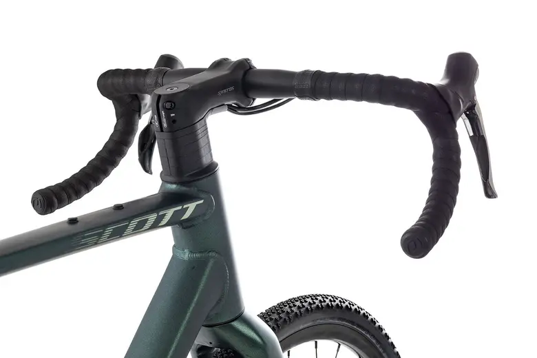 Aerodynamische Syncros Komponenten schmücken das Cockpit. Der Vorbau bietet sogar die komplette Leitungsverlegung in das Steuerrohr. Das maximale Systemgewicht (Fahrrad + Fahrer + Gepäck und Zubehör) gibt Scott mit 120 kg an.